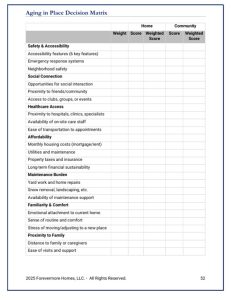 Step 12: Pulling It All Together – Using a Weighted Rating System After exploring the physical, financial, and emotional aspects of aging in place or moving to a senior living community, you may find yourself with more than one good option. So how do you choose? A weighted rating system can help you make a […]